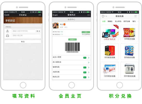 用戶只需簡單填寫信息即可成為藥店會員,并可在會員主頁查詢購藥記錄等基本信息,同時,會員在門店消費會積累積分,積分可通過積分平臺進行商品、代金券等兌換
